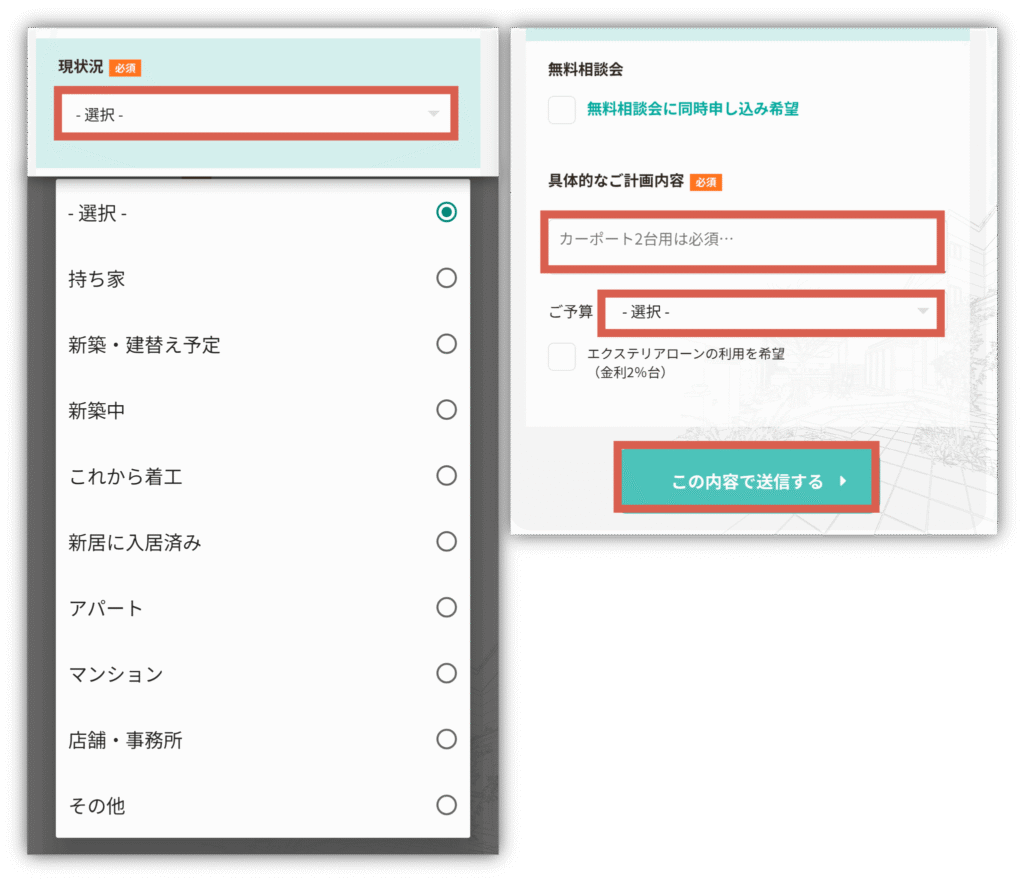 具体的なご計画内容」に、外構の条件や予算を入力し、「この内容で送信する」をタップします🫶